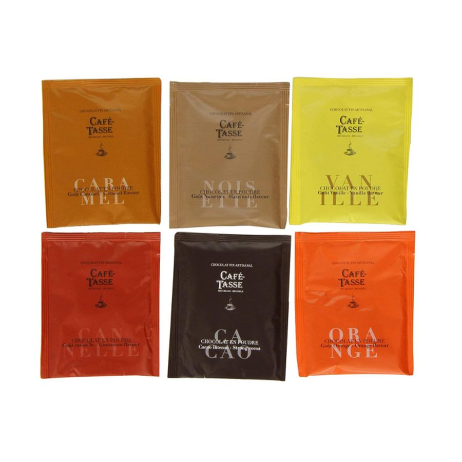 Sorten Noisette, Vanille, Zimt, Karamell, Orange: Zucker, 32% Kakaopulver, natürliches Aroma (HASSELNUSS, Orange, Vanille, Karamell, Zimt).